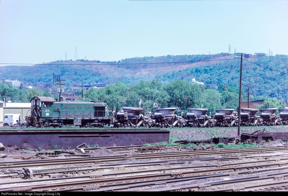 A Weirton Steel S2 brings a string of ladle cars alongside the former PRR yard in Weirton Junction, West Virginia.