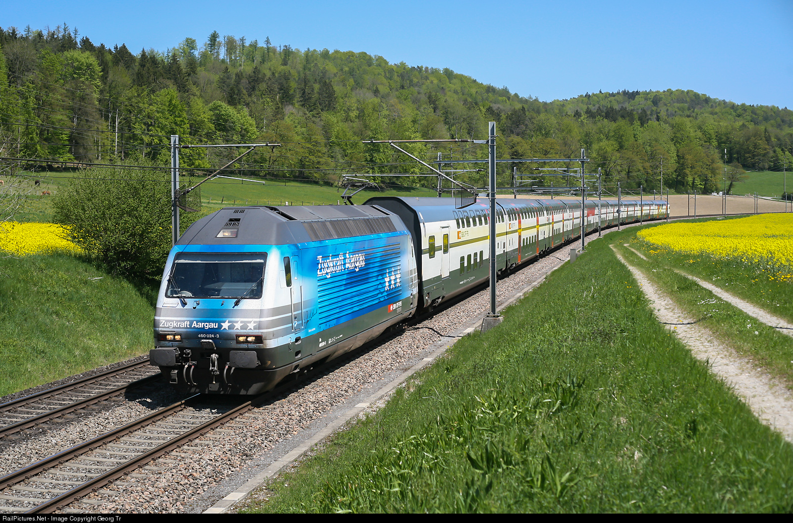| Re 460 # 024 in the publicity paint scheme "Zugkraft Aargau" is pulling the IC2000 doubledeck IC 726 from St.Gallen via Zürich-Bern-Lausanne to Geneva Airport, between Elgg and Schottikon. |