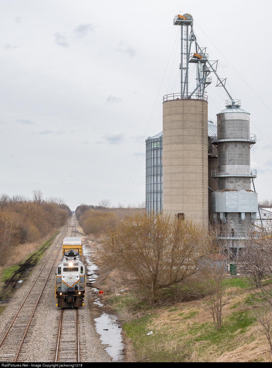 With a tank car and boxcar in tow, GVT ALCo RS-32 number 2035 is seen passing a grain elevator in Knowlesville, NY on its WB run back to Lockport, NY.