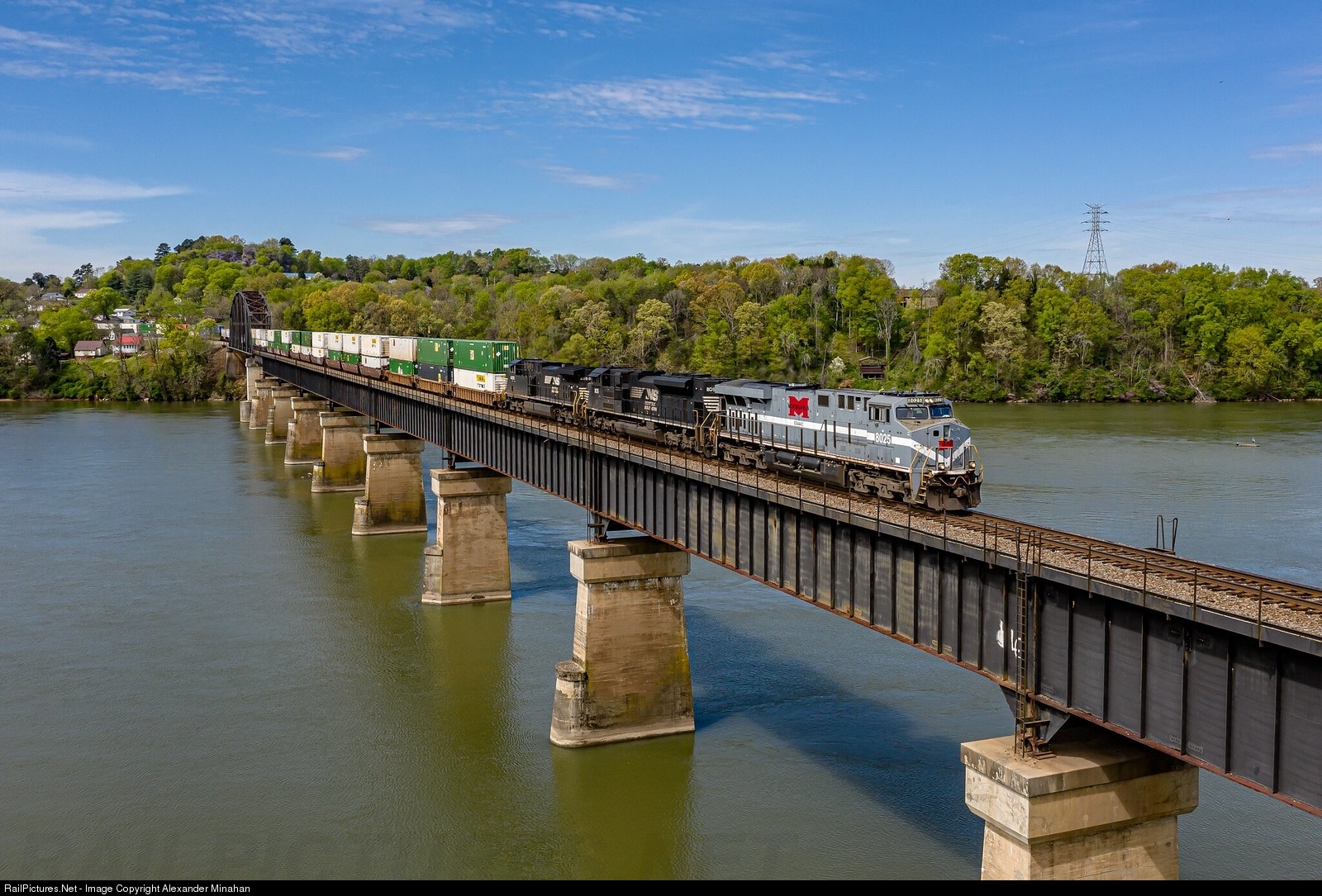 | The Monongahela Heritage Unit leads hotshot intermodal, NS 202, across the Tennessee River in Loudon, TN. |