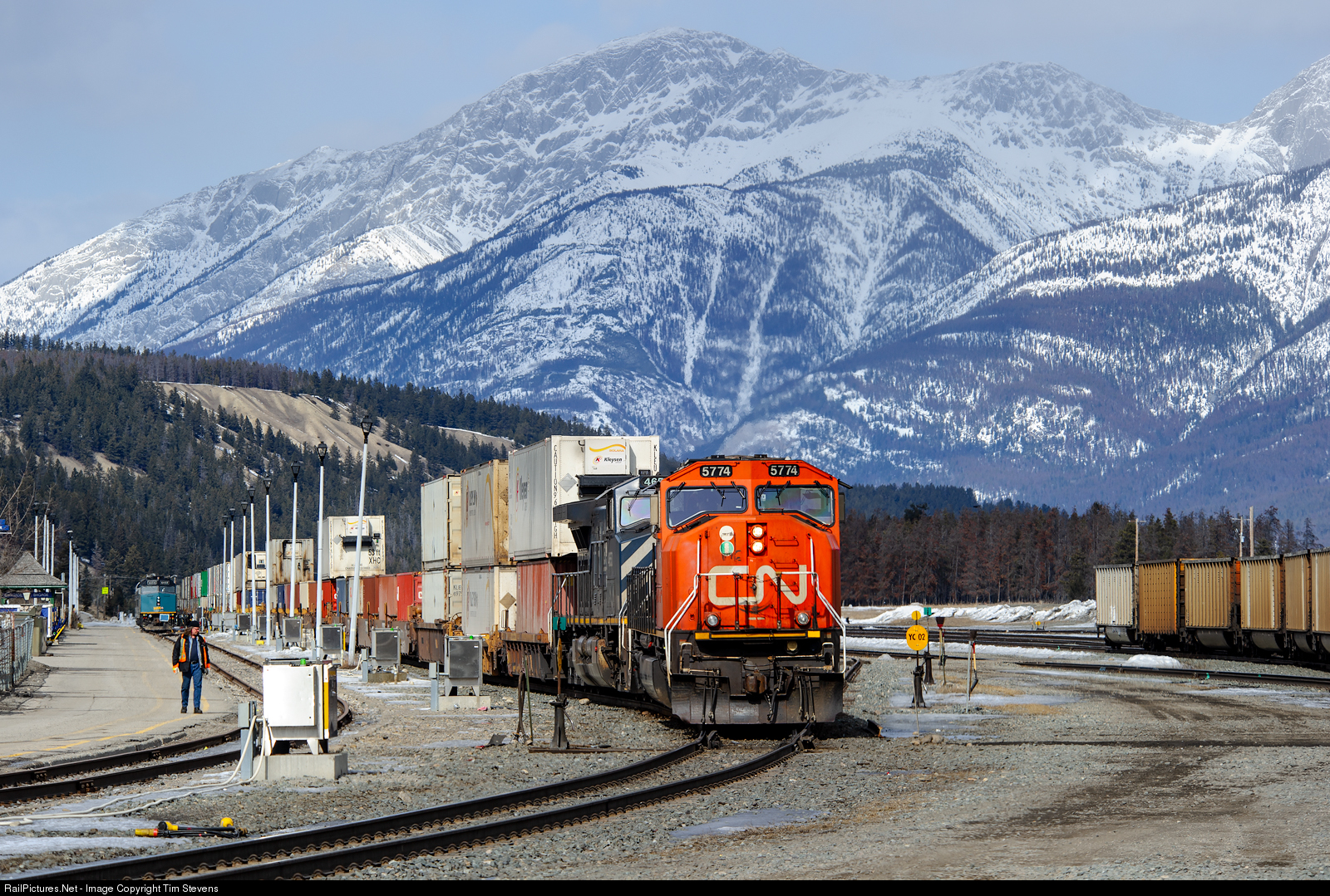 The first Q109 that I can remember to occupy the rails in these parts trades crews off at Jasper, AB. Q109 is a recent change in CN's TSP (Transportation Service Plan), running 2 days of the week between Montreal, PQ and Roberts Bank, BC. Q105 occupies the same slot the other 5 days of the week terminating at Thornton Yard in Vancouver, BC rather than Roberts Bank.