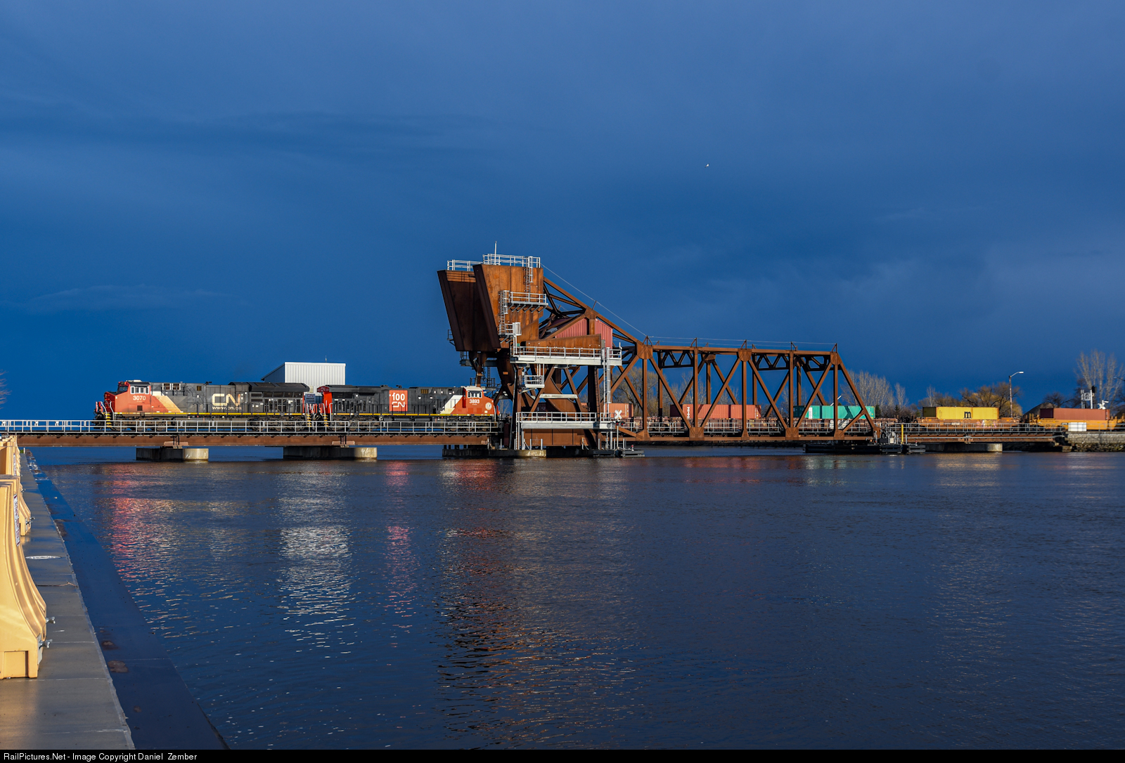 Sometimes trains will end up lining up perfectly, while storms approach from the east as the sun is still shining from the west, a CN Q train makes its way across the Oshkosh Bridge in near perfect storm light.