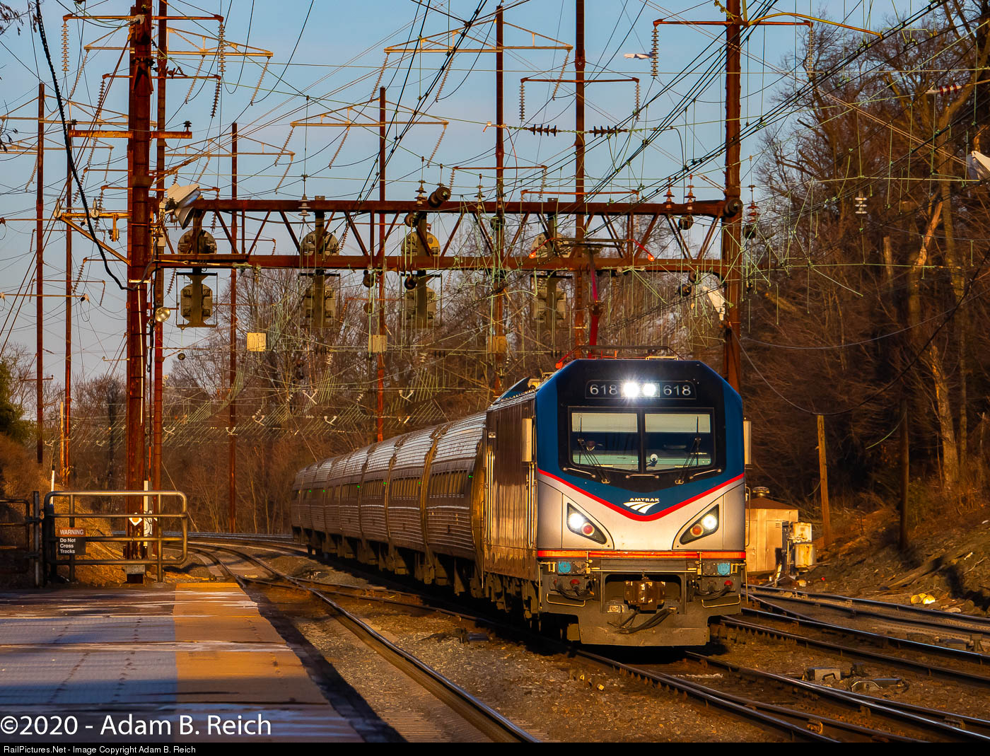 | Golden Hour Power: ACS-64 #618 leads Northeast Regional Train #129 past Metuchen Station during the golden hour on Wednesday, February 19, 2020. |