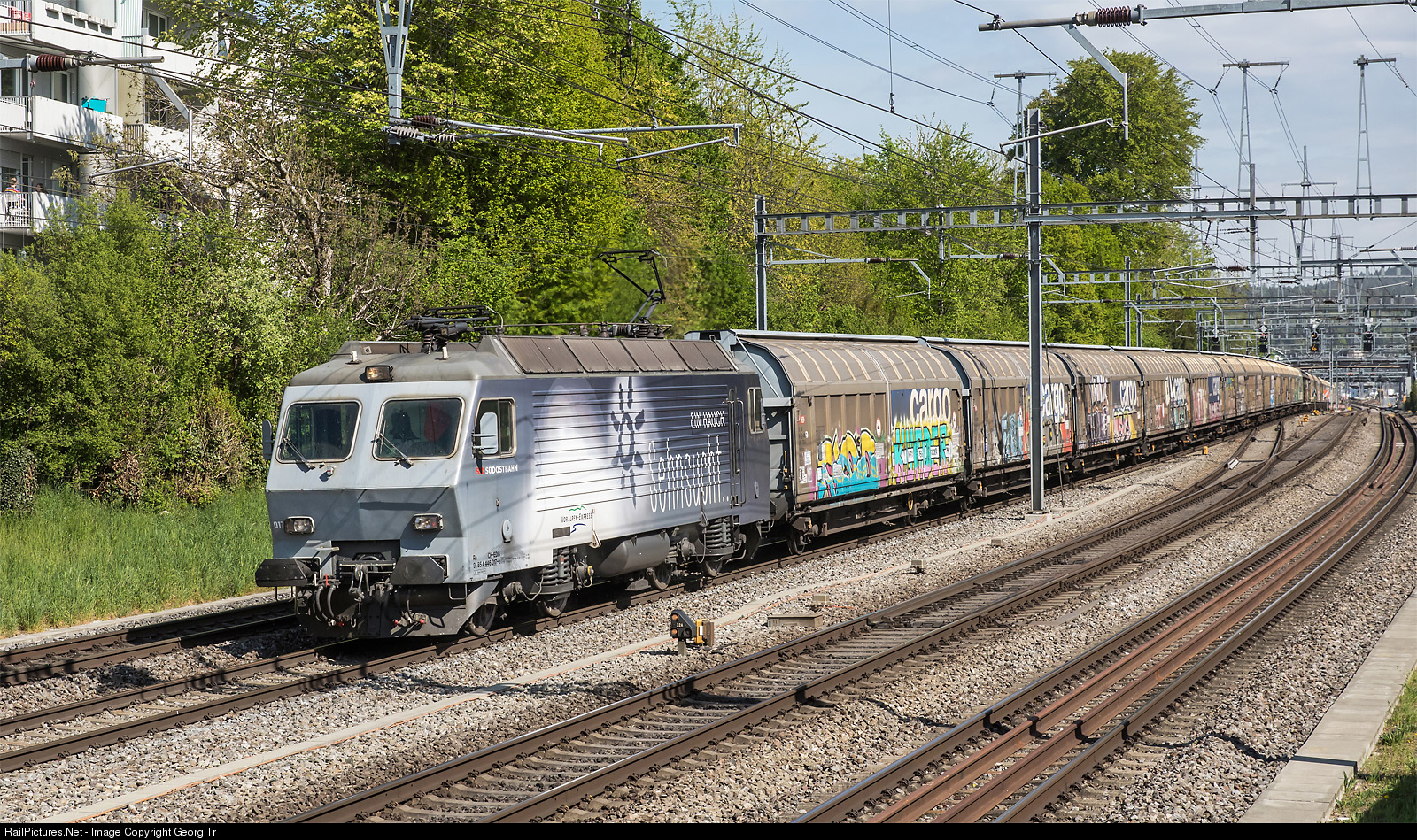| Re 446 # 017 of the EDG in the "Ein Hauch Sehnsucht..." (a touch of yearning...) paint scheme is pulling the freight train 63184 from Romanshorn to the Limmattal shunting yard between Oberwinterthur and Winterthur. The EDG is operating this train of SBB Cargo on mondays and tuesdays on behalf. |
