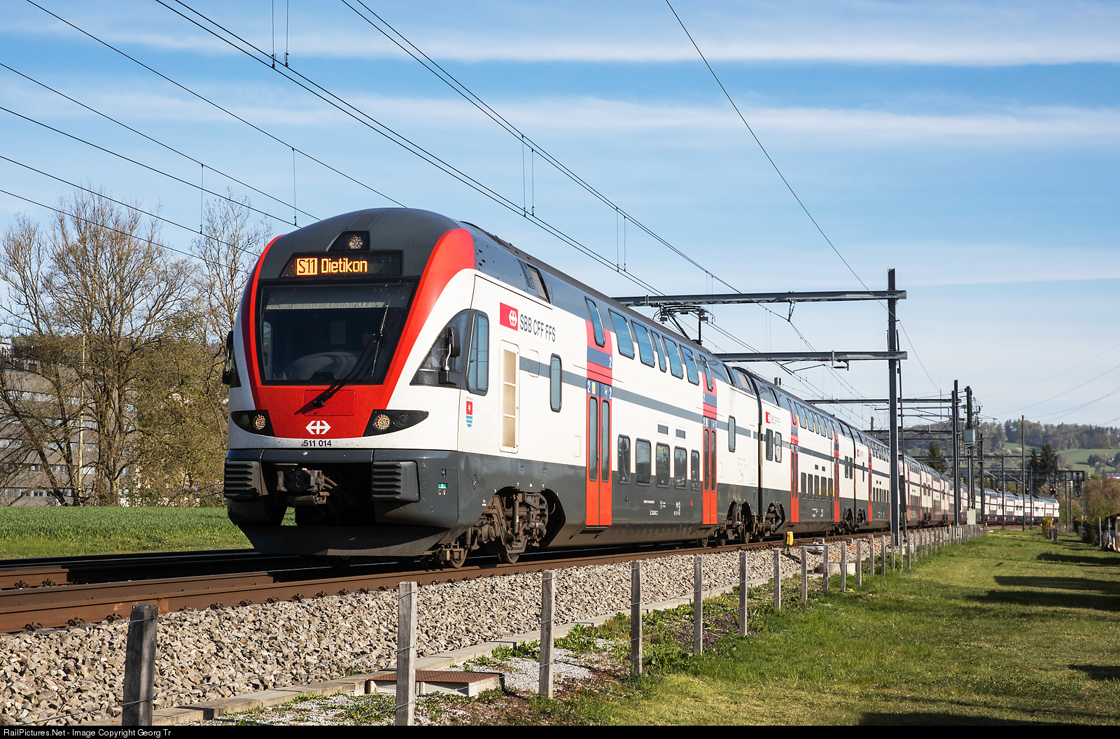 | RABe 511 # 034 is a "RVD" (doubledeck train for regional services) in the dark grey/white paint scheme for regio express services, but used in the moment in the S-Bahn Zürich service. It is leading another of the same series in the blue/white ZVV paint scheme, running the S 11 service 19134 from Wila to Dietikon, in Winterthur Tössmühle. |