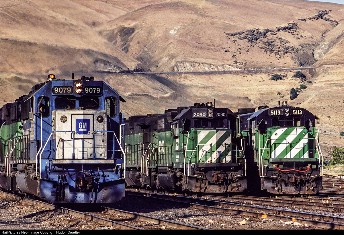 Oakway Leasing OWY 9079 GP60, BN 2090 GP38-2 and BN 5113 GE C30-7 at Wishram.