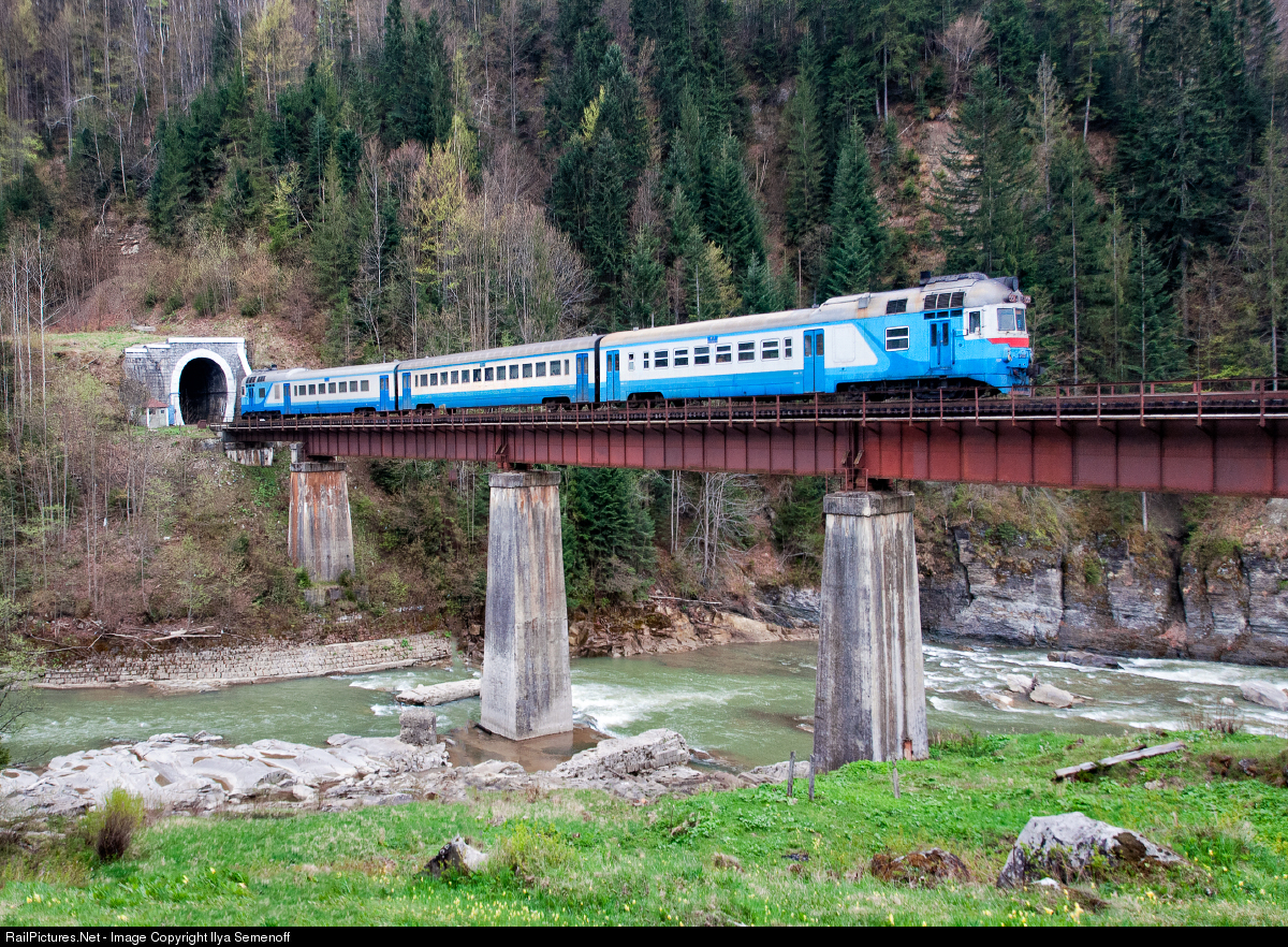 | D1 diesel multiple unit with local train follows on the bridge over the river "Prut" in Carpathian Mountains near Yaremche station. Railroad "Deliatin - Voronenko" built by Austria-Hungary Empire in the second half of the 19th century. This railroad is on of the most picturesque on the territory of former USSR and is rich in complex of engineering structures. At the beginning of 21s century there were held many steam locomotive tours here. |