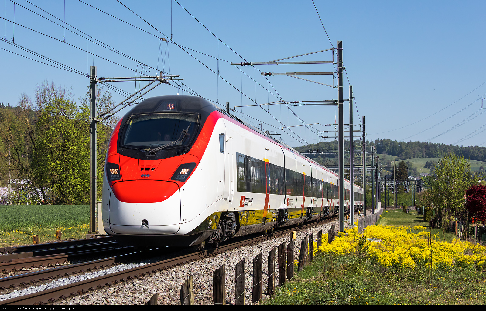 "Giruno" highspeed train RABe 501 # 001 of the SBB is running from the StadlerRail commissioning centre Erlen to Bern Weyermannshaus through Winterthur Tössmühle.
