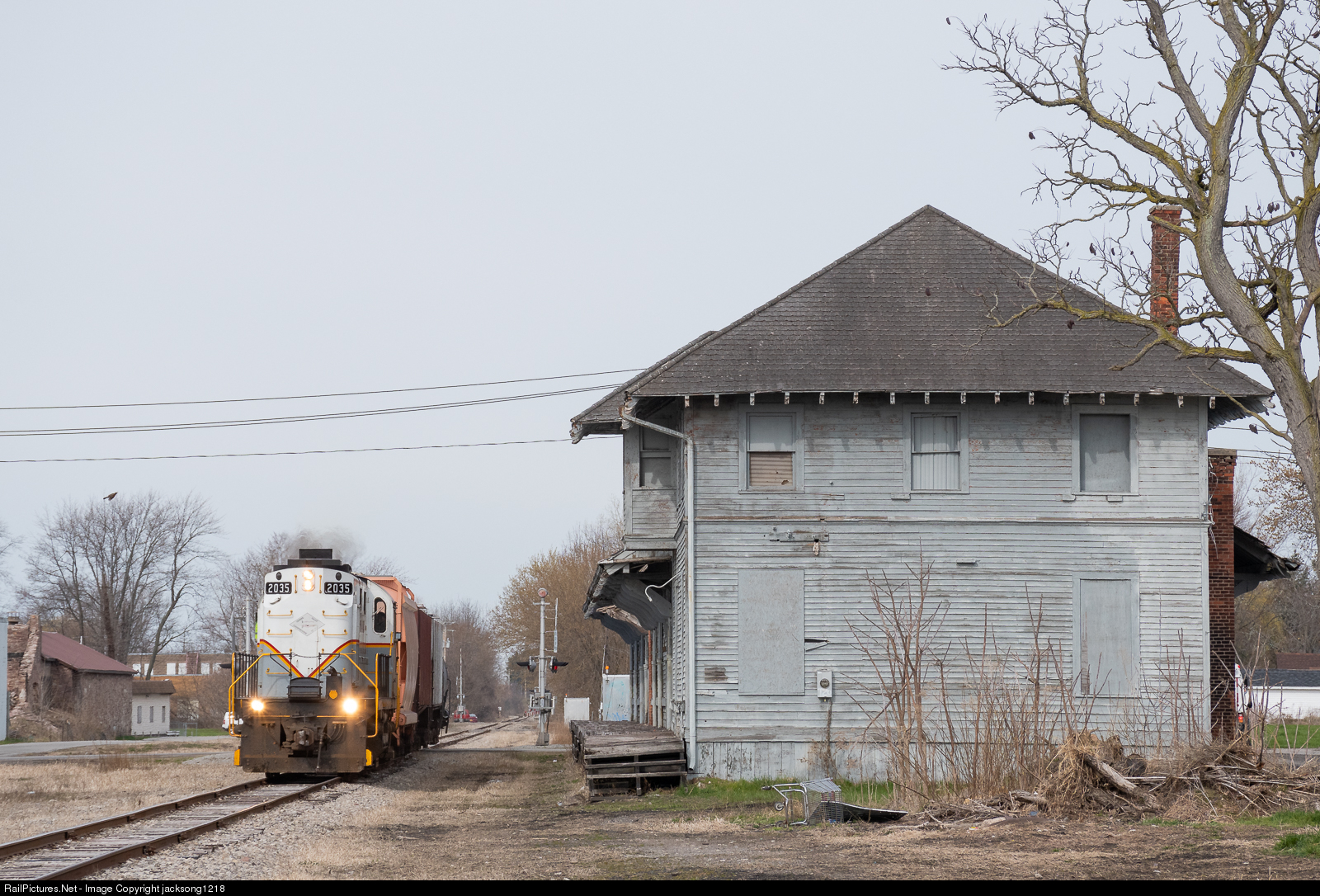 GVT ALCo RS-32 number 2035 runs Long Hood Forward on its EB run towards Brockport as it passes an ex NYC Freight Station in Albion, NY.