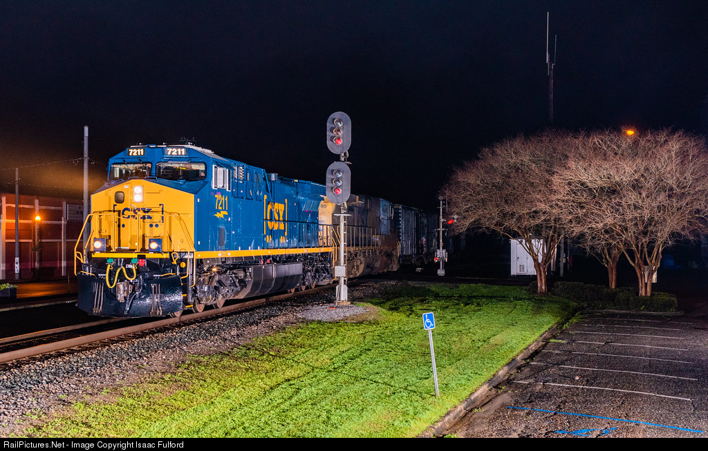 | New CSX CM44AH rebuild 7211 is seen here rolling north in Atmore, Alabama, as a fog rolls in. The train is passing the old Seaboard System Color lights that guard the connection track onto the AGR. |