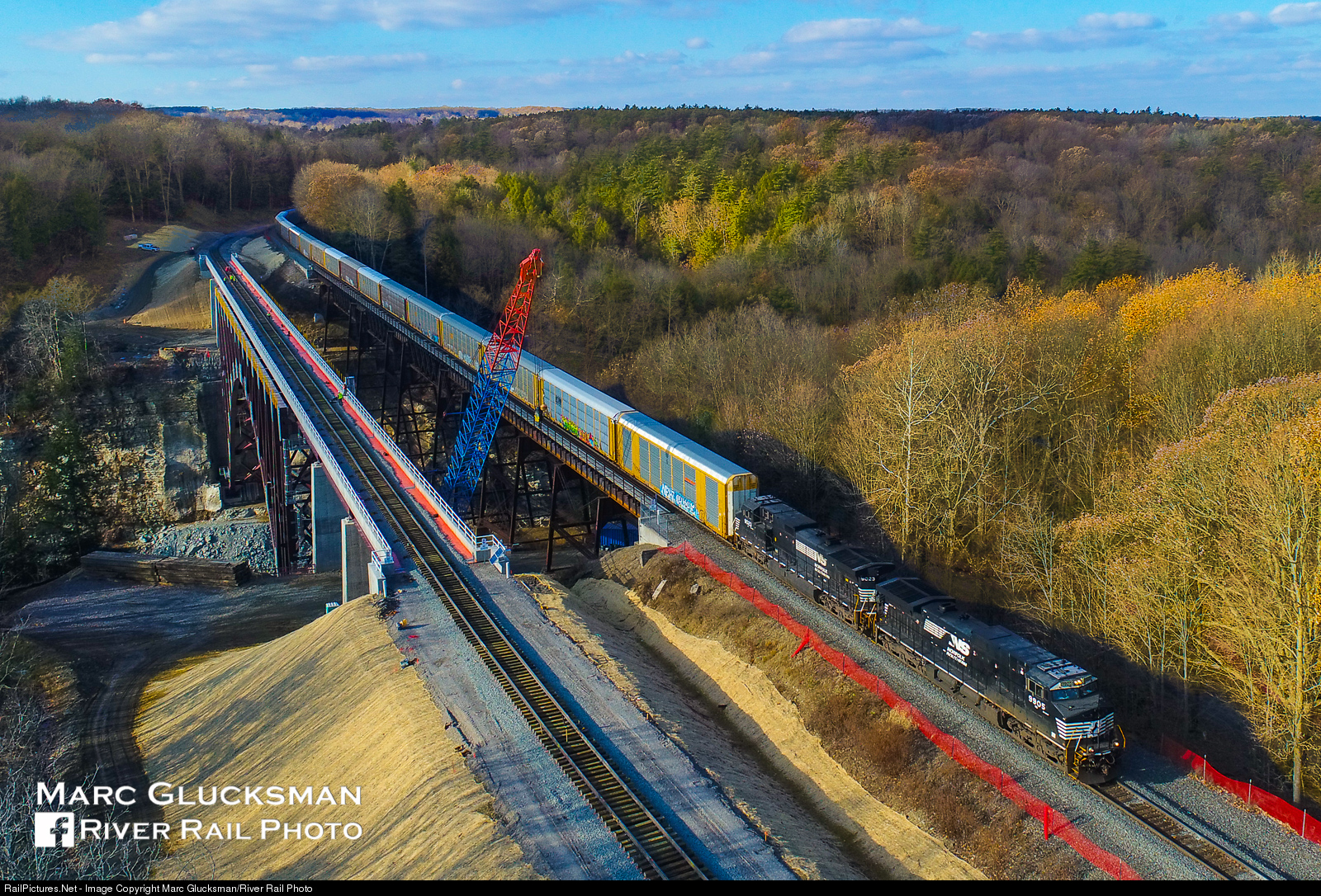 Dual-ing bridges. On the afternoon of Friday, December 1, 2017, Norfolk Southern Corp Train 28N crosses the "old" Genesee Arch Bridge in Letchworth State Park near Portageville, NY. The matched set of 9905(C44-9W)/NS 9023 (C44-9W) leads over the span as the bridge is already in its final days. Opened by the Erie Railroad on July 31, 1875, it would see its last train on the early morning hours of December 11, 2017, and would be replaced by the new span in the foreground later the same day.