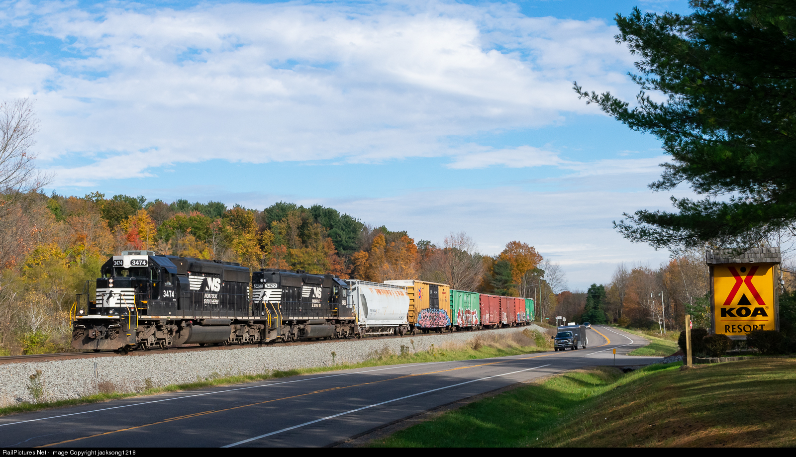 NS EMD SD40-2 number 3474 leads the SB Corning - Geneva H06 as it passes the Watkins Glen KOA campground with fall colors ablaze on the surrounding hills.