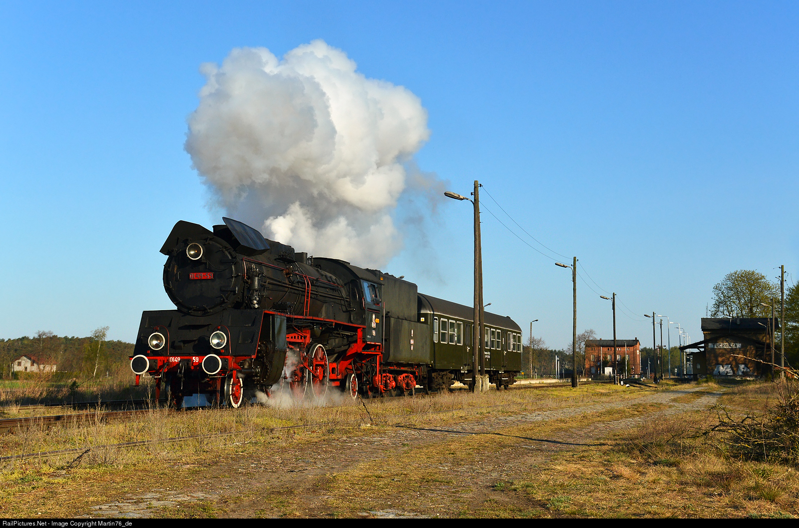 | The Ol49-59 steam locomotive hauling a scheduled morning passenger train from Zbąszynek to Wolsztyn, starting from the passenger stop at Tuchorza. Formerly that was a station, now it has been changed to a passenger stop and all old semaphores have only decorative functions. |
