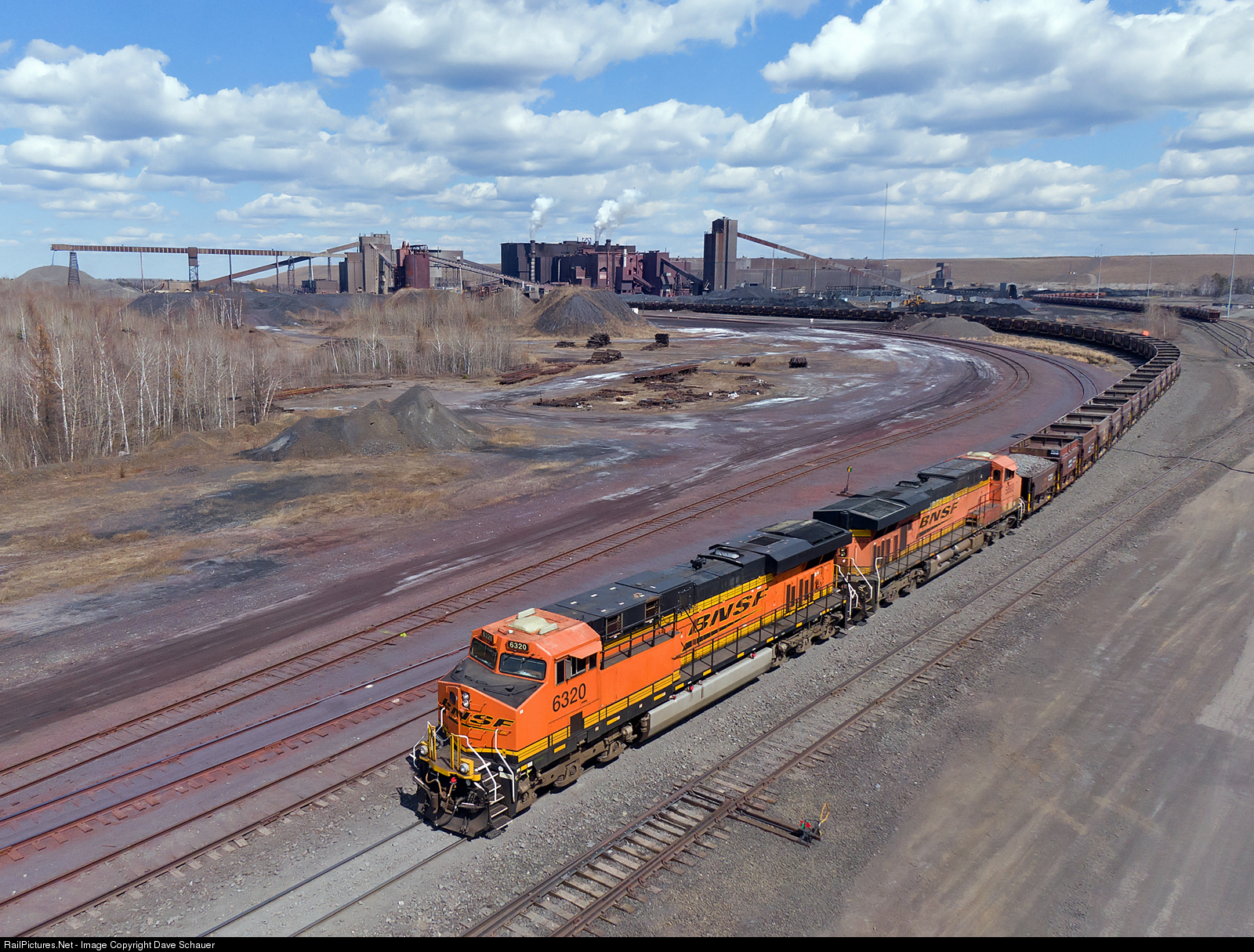 | CN has assigned a number of horsepower payback BNSF and UP AC units to northeastern Minnesota on the former DM&IR. Here two BNSF units power a crude (unprocessed) ore train dumping at the Fairlane processing plant of United Taconite. Normally pairs of CN C40-8s handle these trains. HP payback units are also handling limestone trains out of Duluth. |
