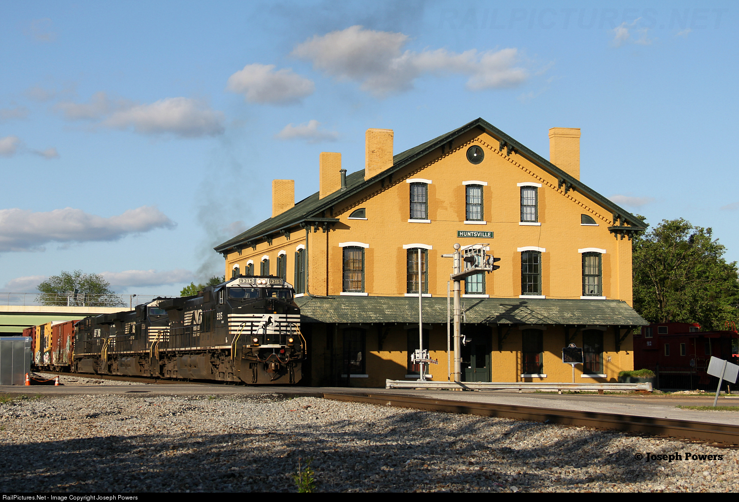 Norfolk Southern train 101 (Bulls Gap, Tennessee to Memphis, Tennessee) rolls west by the depot in Huntsville, Alabama. The structure was completed in 1860 by the Memphis and Charleston Railroad. In addition to being a passenger station, the building was also occupied by the offices of the Memphis and Charleston's Eastern Division headquarters. The depot is now a museum.