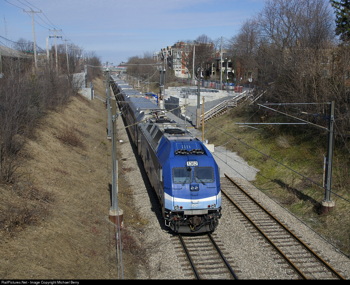 | Down to single track. AMT 1362 is on the rear of a deadhead move that is passing through the combined stations of Canora and Mont-Royal. This line was double-tracked until the summer of 2018 when work started on the REM light rail project. This work necessitated the closure of the existing Canora and Mont-Royal stations, with a new one located roughly halfway between the two stations. The track at right is not in use and has been paved over both north and south of there. This part of the Deux-Montagnes line was supposed to be closed for a number of years starting March 29th, but all work on the REM project has stopped for the time being and trains are still running here. |