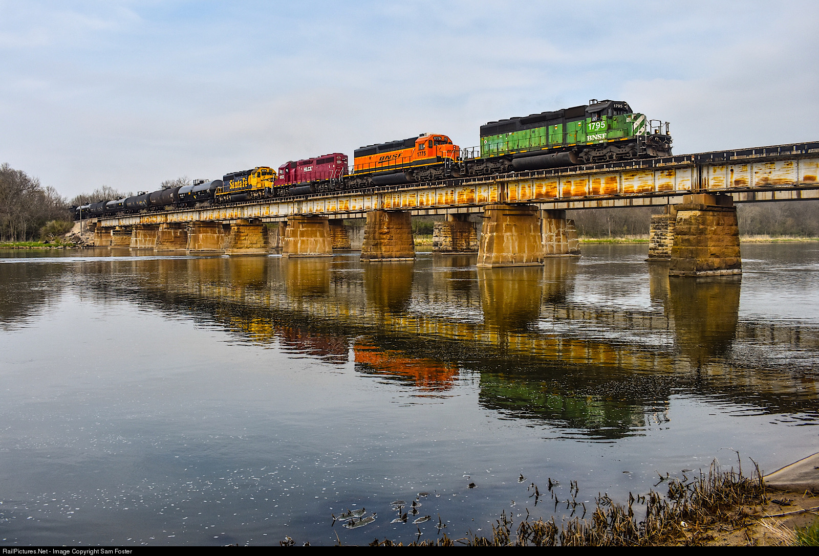 | BNSF 1795, a former BN SD40-2, leads L-CHI105 across the Kankakee River in Lorenzo, IL. |
