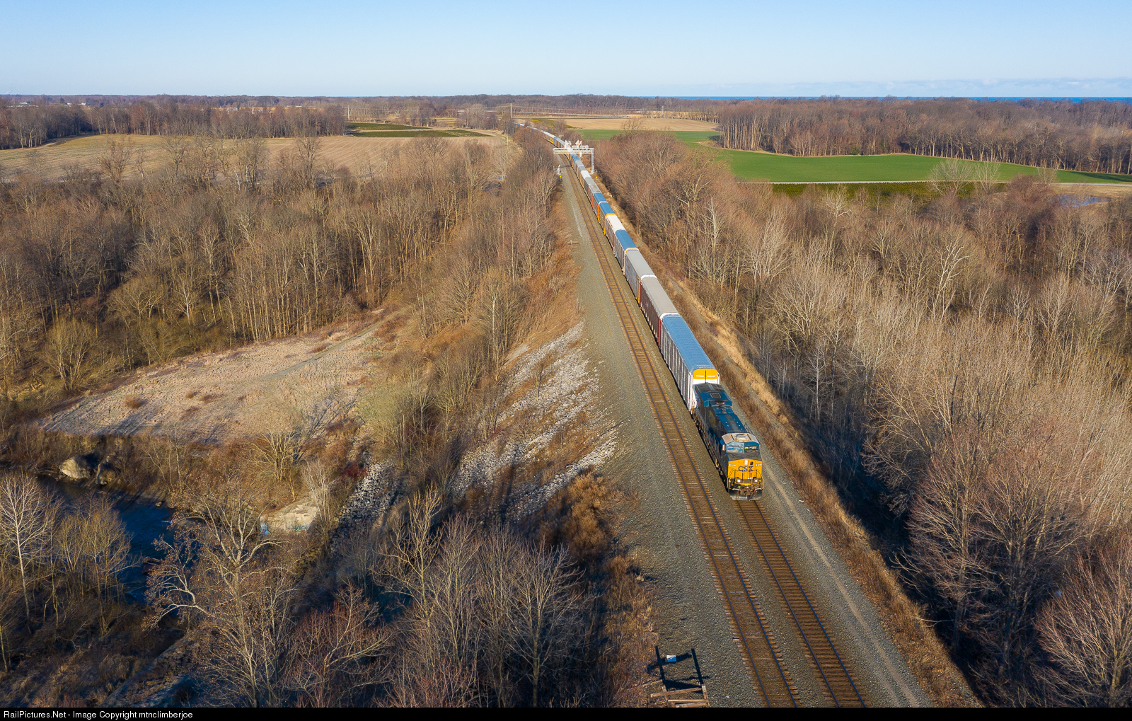 In the early morning sun, CSX Q264 heads east through Lake City, Pennsylvania behind ES44AC 810. The railroad crosses Elk Creek on a massive fill here just west of town.