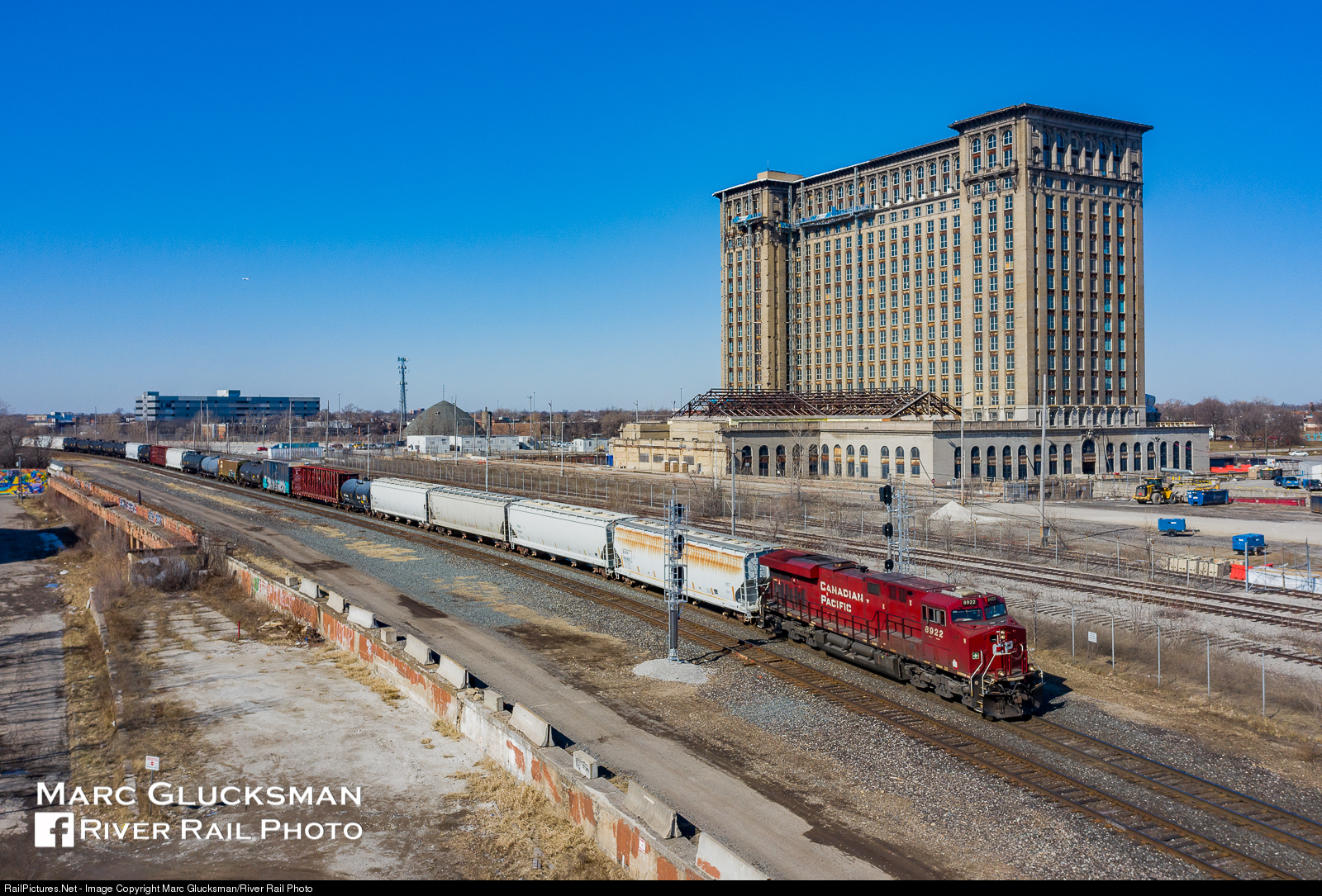 | A new day dawns in Detroit. Canadian Pacific 8722 (ES44AC) leads a manifest train past the Michigan Central Station in Detroit, MI on the morning of February 21, 2020. The former station's future looked bleak until 2018, when Ford Motors announced that it would rebuild the structure as part of its Corktown Campus. |