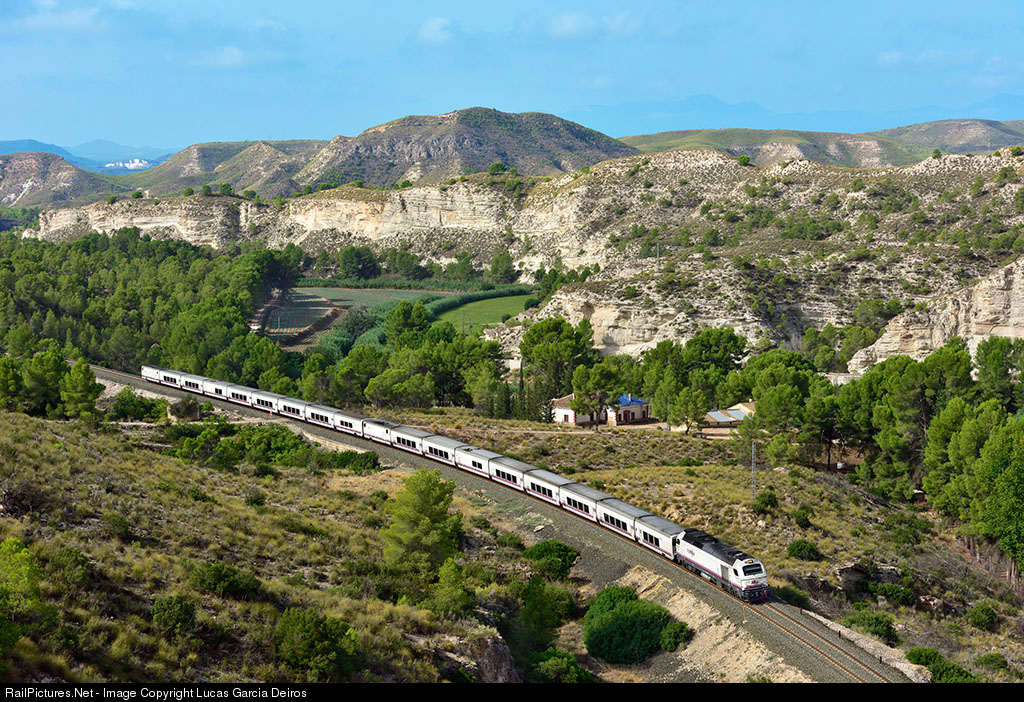 | Altaria from Cartagena to Madrid Chamartín just before passing through the Almadenes Canyon, at the site known as the end of the "World" (referring to the river that mouth a few kilometers down). Due to the return from summer holidays, several services between Cartagena and the capital were reinforced with two branches of Talgo. It should also be noted that the opening of the new Camarillas variant between Cieza and Agramón meant the end of this railway section. Thus, March 1, 2019 was the last day that trains ran on these tracks. |