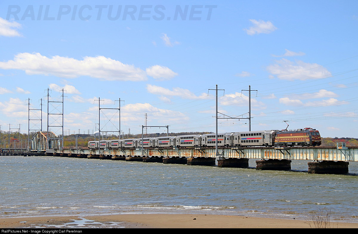| A Long Branch to New York train, with PRR wrapped ALP46A 4636 for power, crosses the Raritan River. |