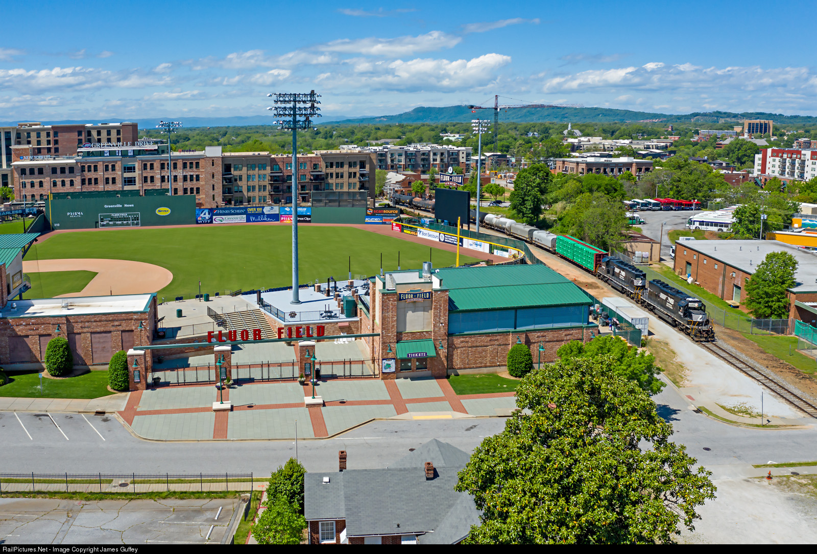 | P76 inches past an empty Fluor Field, home of the Boston Red Sox single-A affiliate, the Greenville Drive. The "Green Monster" and Fenway replica scoreboard are visible in left field. Paris Mountain and the Blue Ridge lie to the north. |
