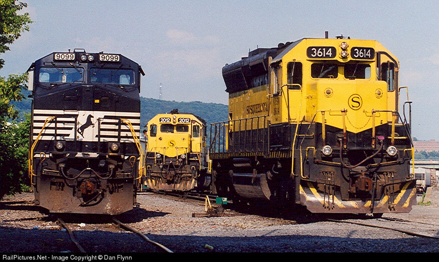 Train 205 (NS 9099) awaits a recrew, while two NYS&W units drill the yard.
