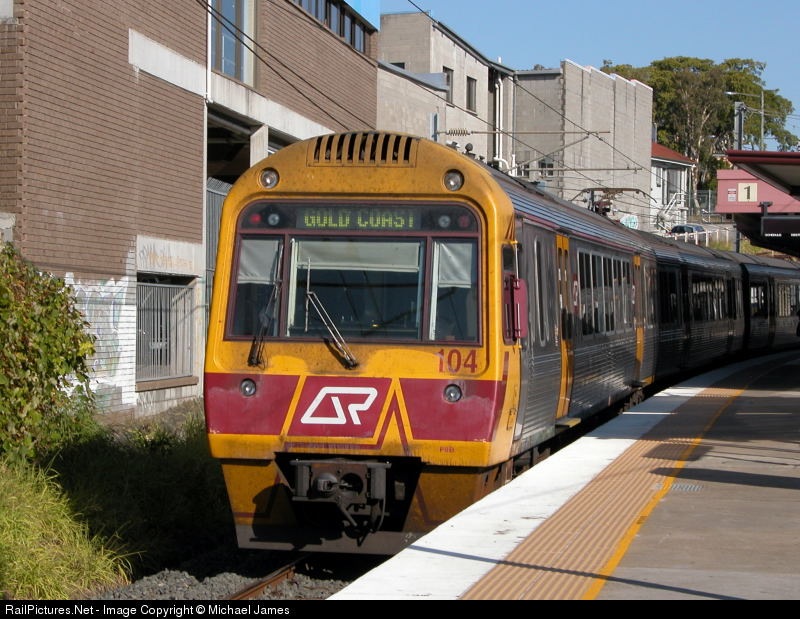 100 Series Suburban Multiple Unit 104 departs Bowen Hills on the Inner City Line with an afternoon service to the Gold Coast