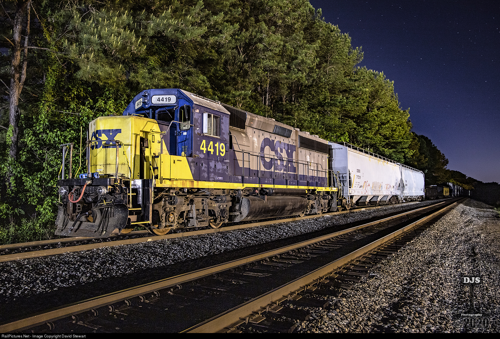 One of the few remaining YN2 painted standard cab units on the active roster, CSXT GP40-2 4419 is at Lagrange, Georgia in the early hours of April 25, 2020 while assigned to A720.