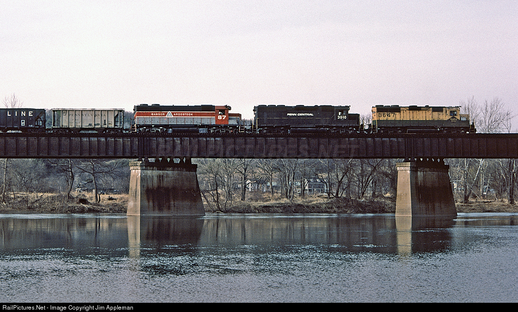 Power consist on this mixed freight includes PC 3010 GP40 and BAR 87 GP38. The power is seen on the bridge over Pine Creek and is on former NYC trackage from SR Tower to Avis Yard. The train is switching Avis Yard and is Syracuse, NY bound.