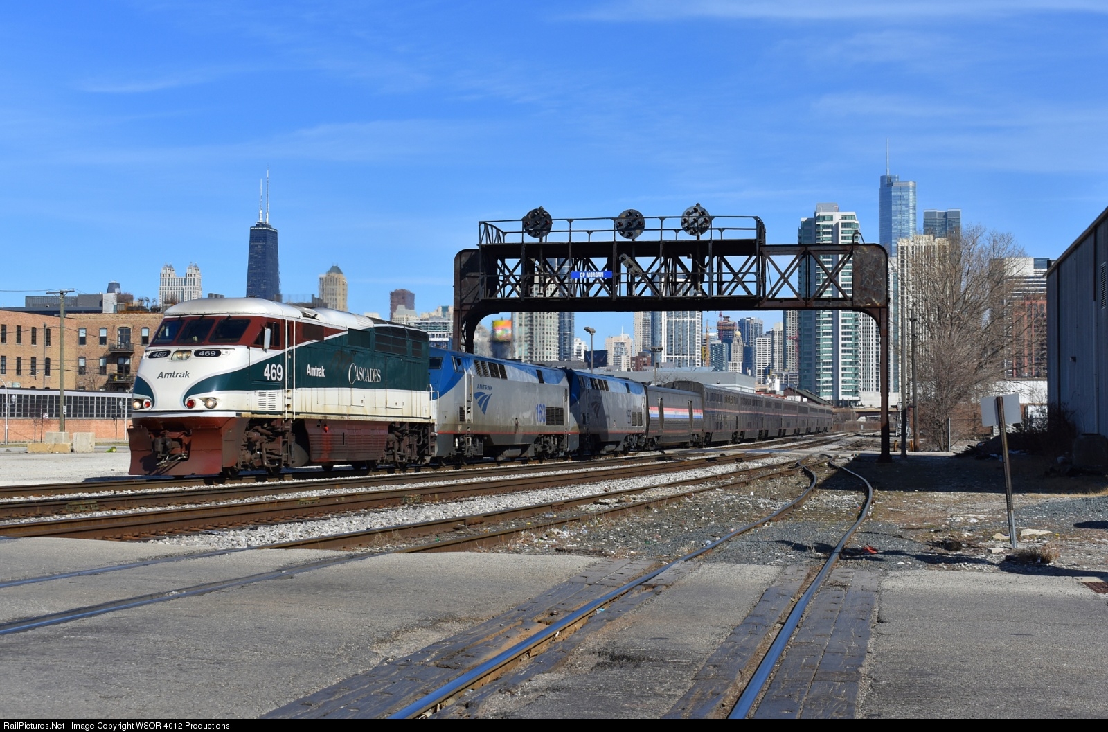 Amtrak 469, a cascades F59PHI leads Amtrak 7 under the Pennsylvania position lights at CP Morgan in Chicago, IL. these signals have since been taken down and 469 now wears metra livery as METX 92.