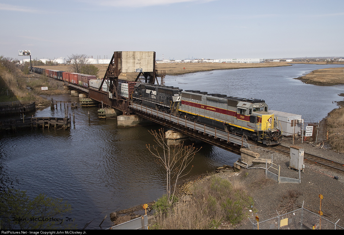 NS #1700, in its As Delivered Erie Lackawanna paint, is seen leading OI-16 south across the Rahway River at KAREN on Conrail Shared Assets Garden State Secondary..