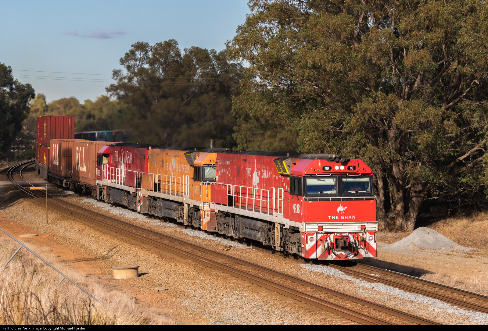| In quite a rare locomotive combination for Western Australia, 3 passenger painted NR Class locomotives (NR18, NR31 & NR75) head east through the Swan Valley on Pacific National train 1SP6.
