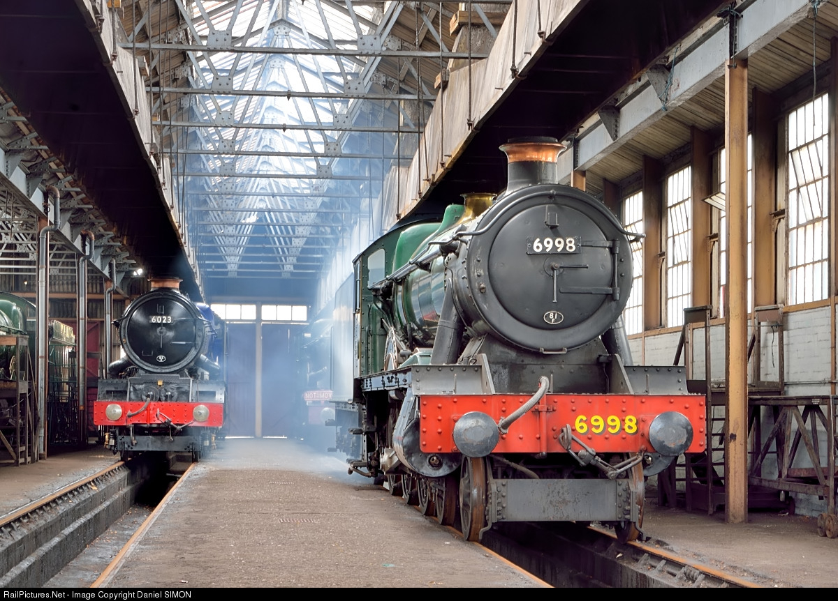 #6998 "Burton Agnes Hall" emerged from Swindon Works in January 1949, going initially to Cardiff's Canton depot. It survived until withdrawal by BR from Oxford in January 1966 after being honoured as the engine chosen to work the Western Region's last steam-hauled passenger train. In markedly better condition than the other survivors, it was selected by the Society to represent the typical two cylinder Great Western tender locomotive, no others at that time being expected to survive. The locomotive was purchased by the Great Western Society in January 1966 for the sum of £2.500 and on 2 April worked light engine under her own steam from Oxford to the Society's Depot at Totnes via Didcot, Reading West, Newbury, Westbury, Taunton, Exeter and Newton Abbot. She remained at Totnes until the end of 1967 when she worked an epic railtour from Totnes to her new home at Didcot on 2 December that year, hauling No. 1466 (also in steam) and Dreadnought No. 1299, all third No. 5952 and auto-trailer No. 231. At Didcot the locomotive has been in virtually continuous service, also with plenty of main line and preserved railways use, ever since. It was was withdrawn from service in 1996 and is stored complete awaiting its turn in the queue for overhaul. Source: Didcot Railway Centre Internet homepage.