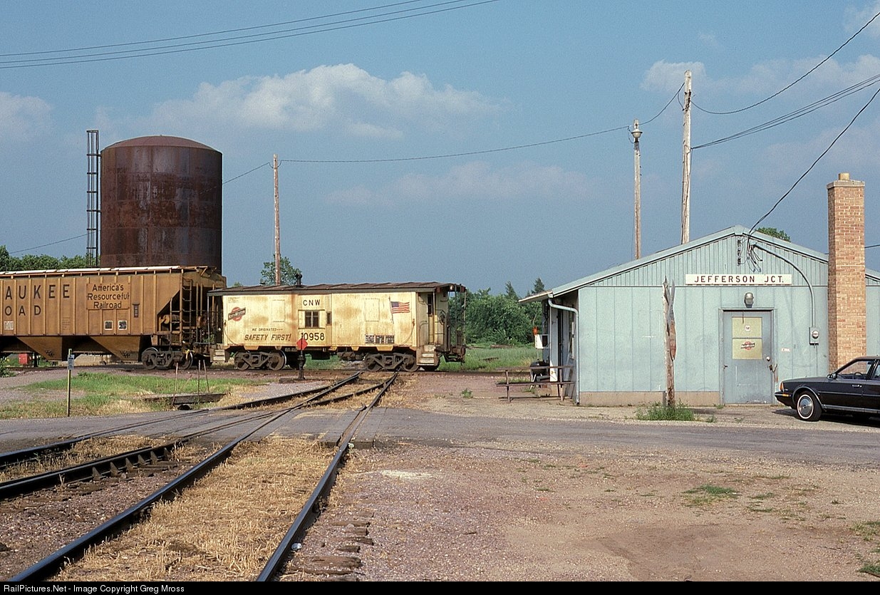 CNW caboose 10958 is on the tail end of a northbound train about to depart Jefferson Jct. for Clyman Jct. Jefferson Jct. was the crossing of CNW's Milwaukee-Madison line and the Fond Du Lac-Janesville line. The Milwaukee-Madison segment was gone (except for some short stubs at the Jct.)when this photo was taken. Today, only the Clyman Jct.-Jefferson portion of the Fond Du Lac-Janesville line remains in service.