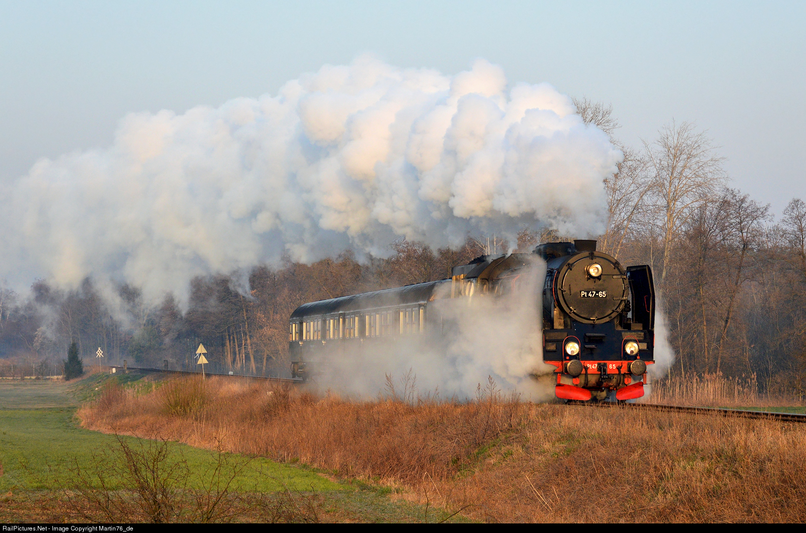 | Illuminated by the morning sun , steam locomotive Pt47-65 hauling a scheduled passenger train from Wolsztyn to Poznań, approaching the station Rakoniewice. |
