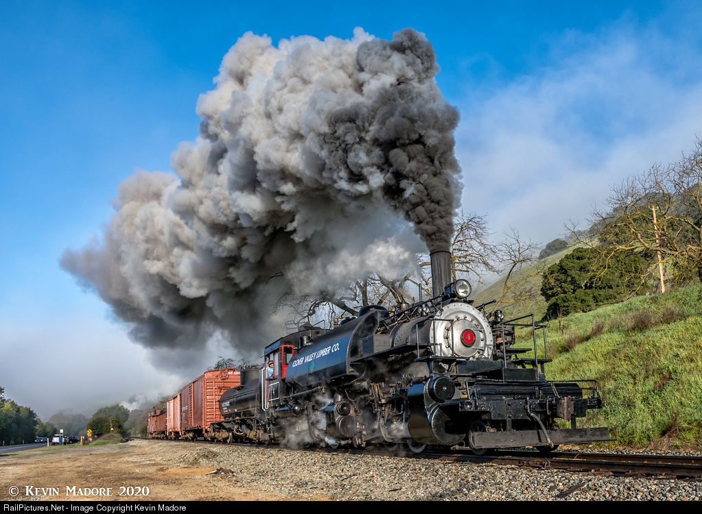 Mixed freight to Sunol. With a marine fog bank just beginning to burn off of Niles Canyon, Clover Valley Baldwin #4 hauls a consist of mixed freight east toward Sunol. Operating on roughly 6.5 miles of track between the Niles section of Fremont, California, and Sunol, the Niles Canyon Railway was once part of the Central Pacific portion of the original Transcontinental Railroad. This section was completed in 1869 and linked Sacramento to the San Francisco Bay Area. Although it quickly became a secondary line, trains from the Central Pacific, and later, the Southern Pacific, operated here from 1869 until 1984, when the Southern Pacific finally ceased operations here. Since then, the line has been operated by the Pacific Locomotive Association as a tourist railway and museum. The operation depicted in this photo was a photo freight run in February of 2020 for Lerro Productions, Inc.