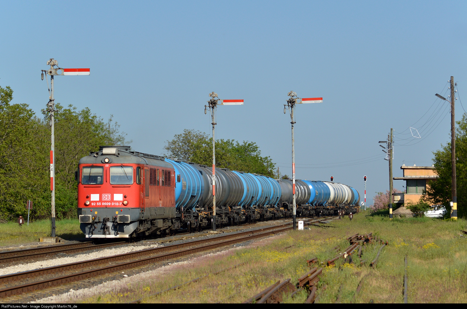 | Romanian diesel locomotive 060DA in the service of DB Schenker Rail Hungary hauling a tanker freight train passing the Börgönd station. The station has preserved and fully functional mechanical semaphores, which is slowly becoming rare on European railways. |
