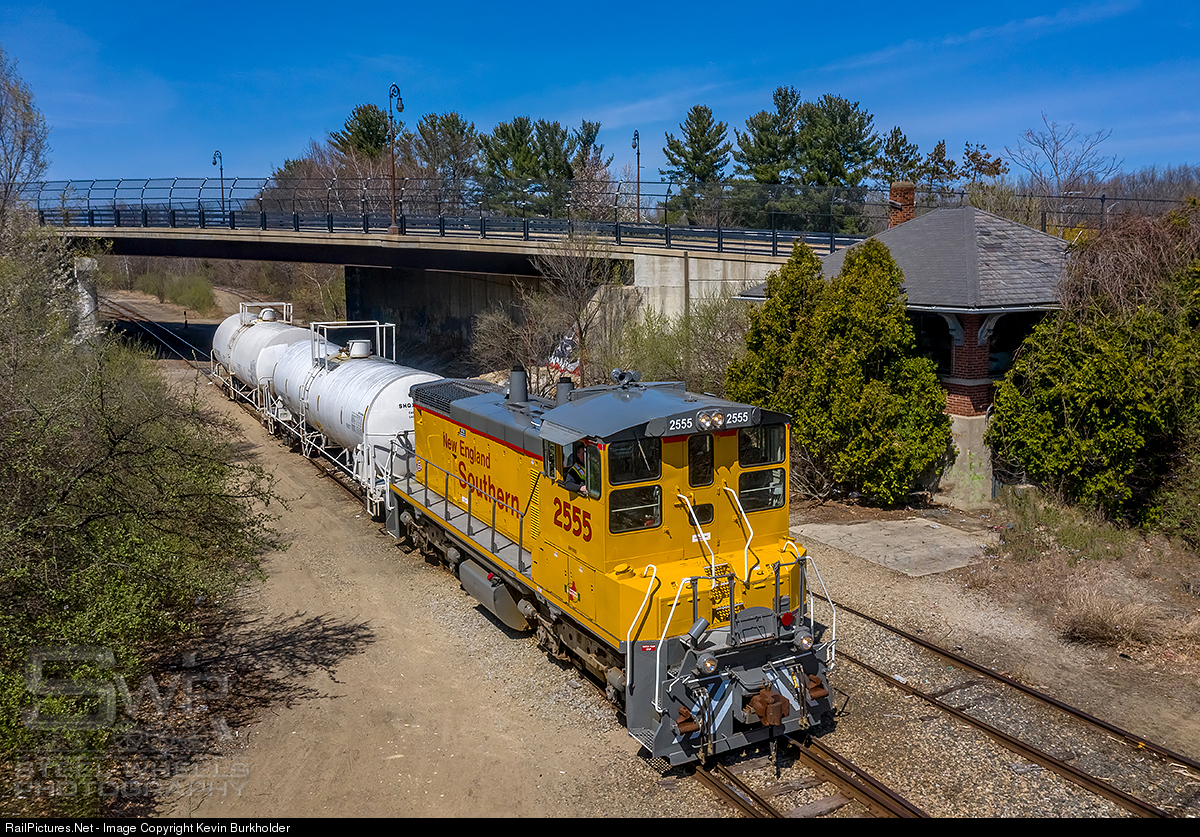 | New England Southern SW1500 2555 leads two empty tank cars from 3M in Tilton back to the PAR interchange in Concord, NH. The 2555 is passing the former B&M Concord Tower as it prepares to drop the tanks for the PAR.
