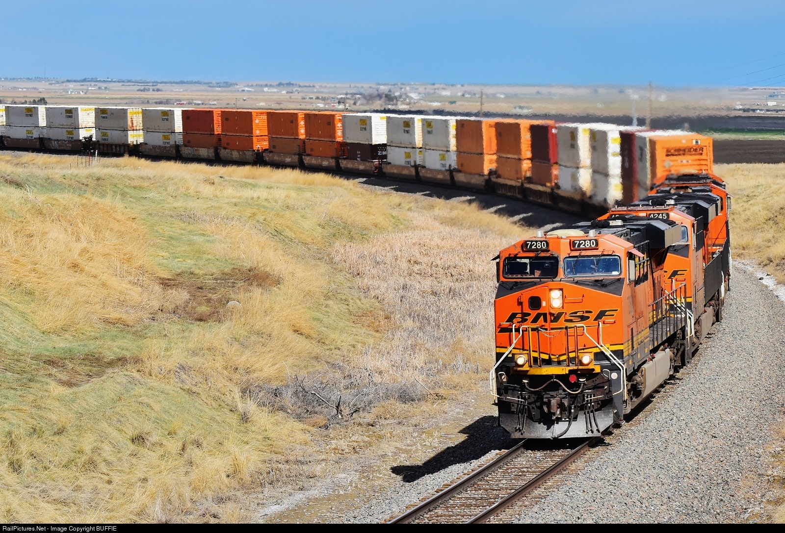 BNSF 7280 (ES44DC) leads a stack train through Kennesburg on its way to Denver, Colorado.