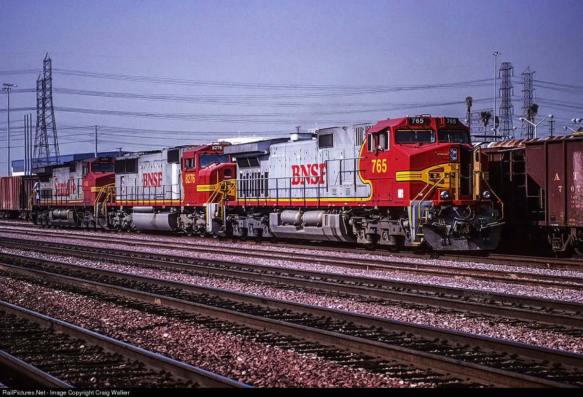 | A set of light power backs down of the tracks in the Burlington Northern Santa Fe Railway's Commerce Diesel Service facility in April 1998. All three engines are wearing the BNSF version of Santa Fe’s 1990s-era "Superfleet" paint scheme, which is based upon the classic Santa Fe "Warbonnet" scheme: BNSF Dash 9-44CW 765, BNSF SD75I 8276 and ATSF Dash 9-44CW 641. (Commerce, California – April 1998) |