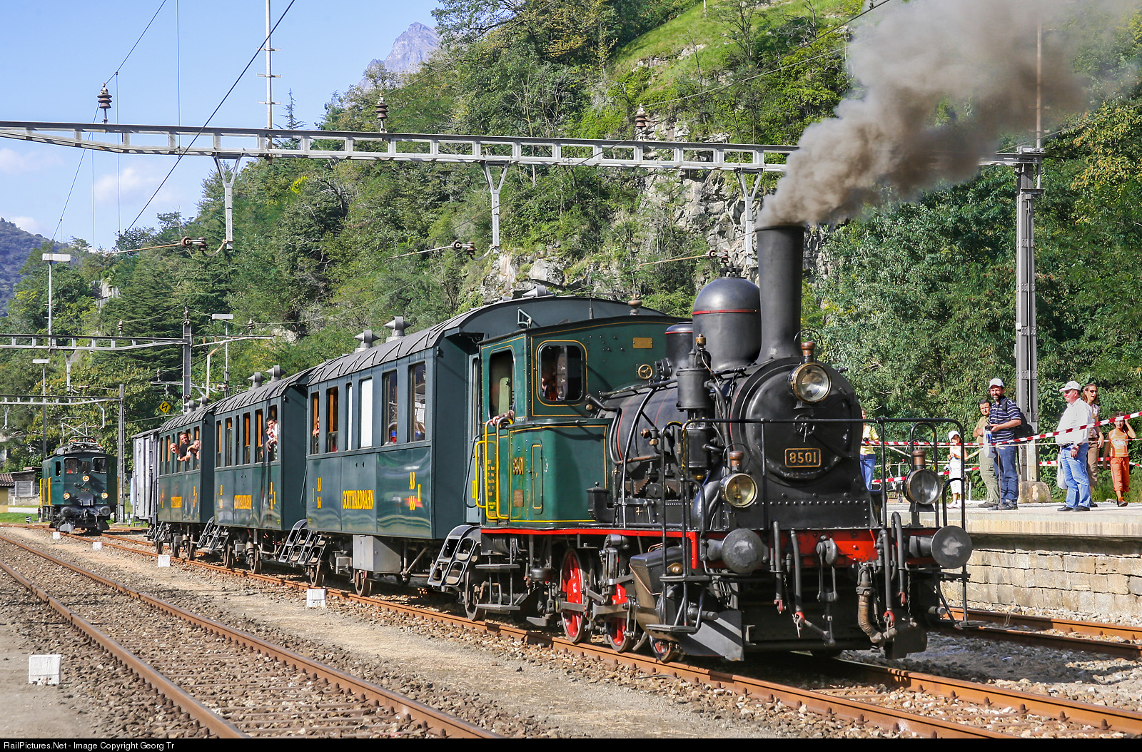 The 0-6-0 steamlocomotive E 3/3 "Tigerli" # 8501 was built in 1910 by the SLM Winterthur for the SBB. From 1958 it was rented to the HOVAG Ems for shunting services and sold to this compagny in 1963. In 1976 it came to the Oswald Steam, Samstagern (OSS) and was entirely refurbished in this color. In 1993 it was sold to the association CSG - Club San Gottardo in Mendrisio, together with the 3 beautiful passenger cars with inscription "Gotthardbahn". This nice steamtrain made short trips in Biasca station this day, when 125 years of the Gotthard line was celebrated. In the background is electric locomotive Ae 3/5 # 10217 of SBB Historic.