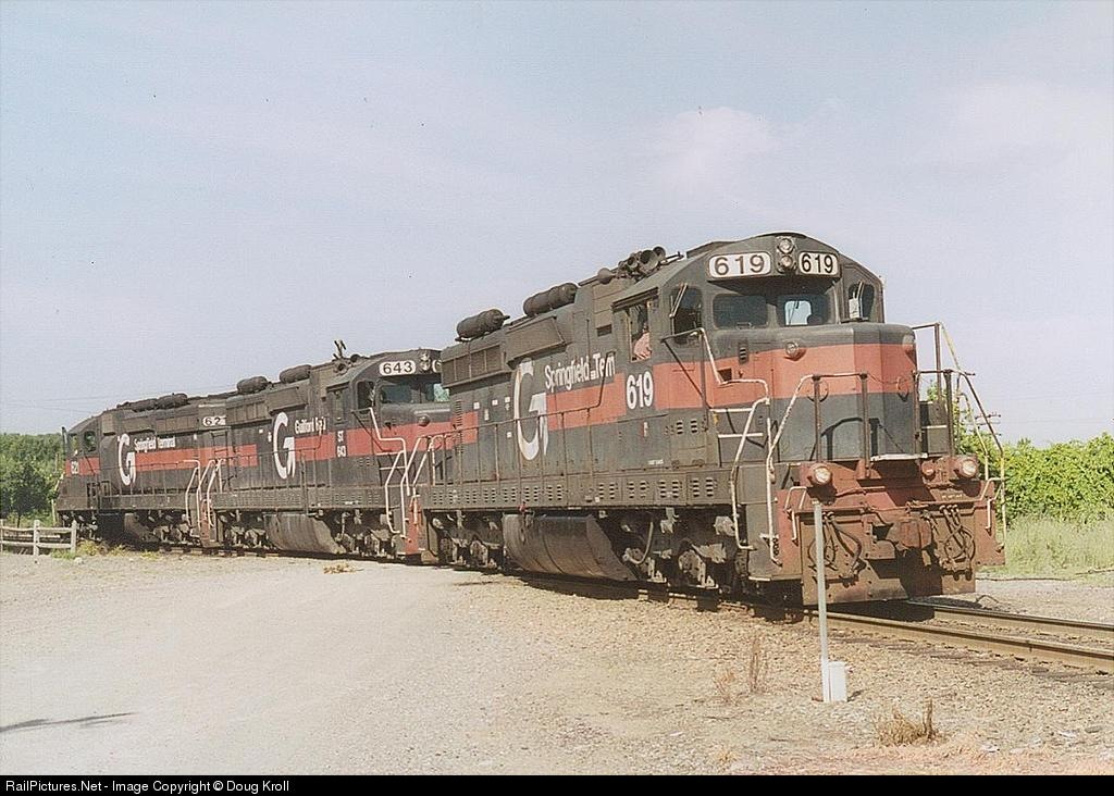 | 3/4 of Guilford's remaining SD26 fleet, #619/643/621 round the wye at Ayer as they head back to their train after making setoffs. |