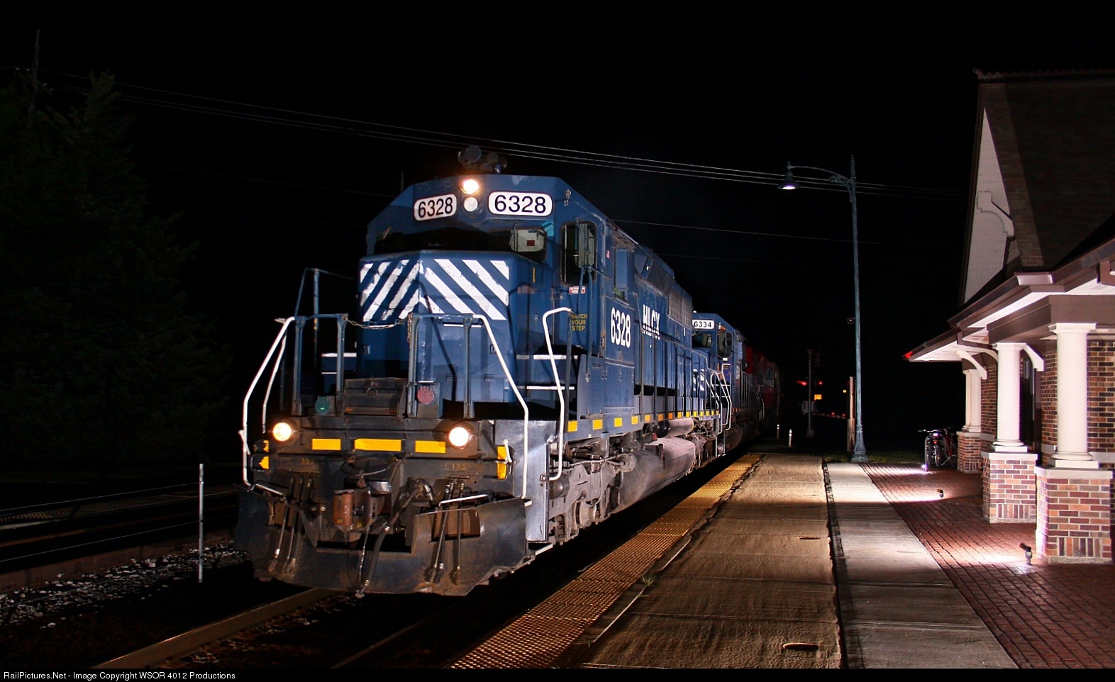HLCX 6328 leads the T-004 through Grayslake on a cool August night. This unit is no longer on the WSOR system.