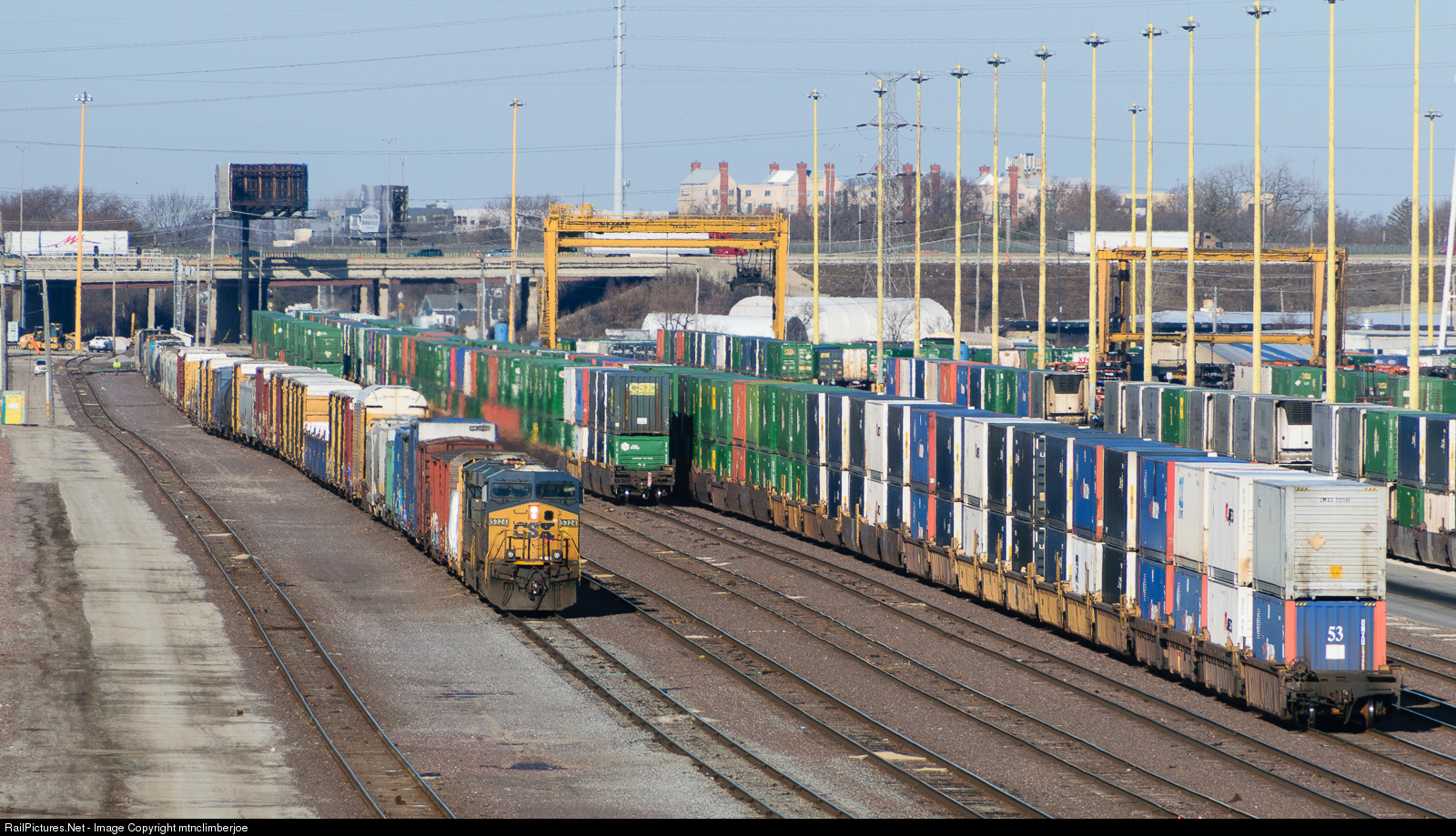 A pair of CSX ES40DC's are on the point of a transfer freight in Melrose Park, Illinois getting ready to depart the Union Pacific Proviso Yard and head east for home rails.