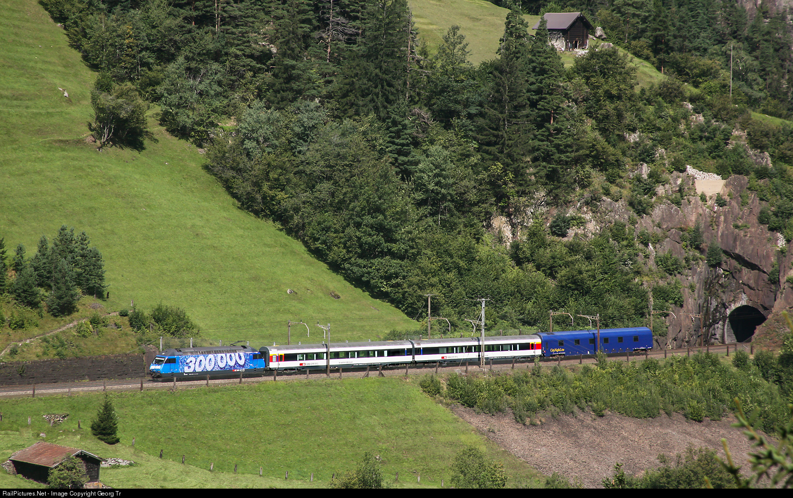 | Re 460 # 106 in the publicity paint scheme for 300'000 GA (GA is the travelcard for unlimited use of all public transport in Switzerland) is pulling a transfer train from Erstfeld to Biasca on the Gotthard north ramp, leaving the Muhren tunnel between Gurtnellen and Wassen. The first cars are the two "Salon de Luxe" parlor car of the SBB, followed by a blue doubledeck sleeping car of the "City Night Line" (CNL) company. The vehicles go to the exposition in Biasca for 125 years Gotthard line over the following weekend. |