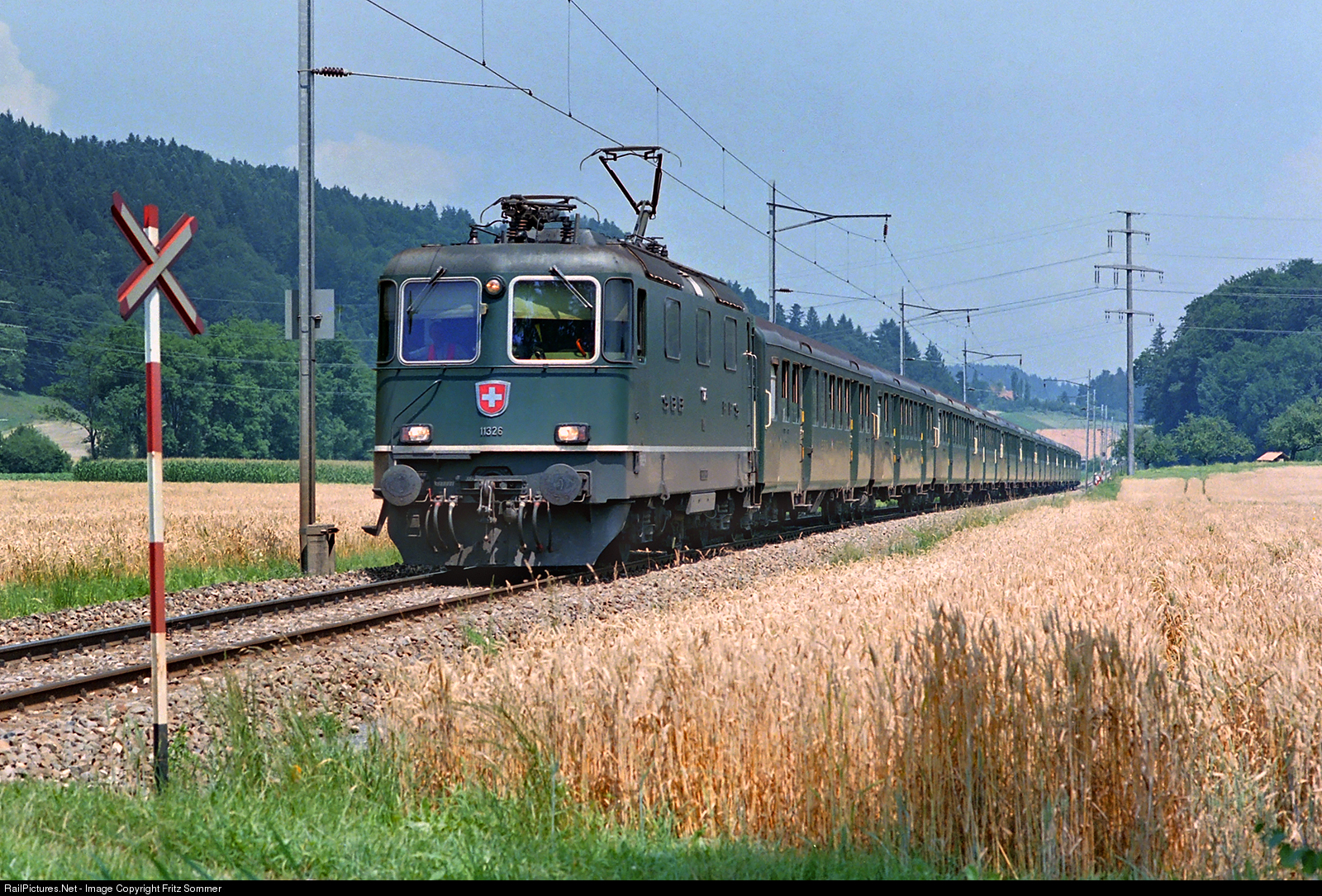 | At the end of the series of pictures of "Cuntrast94" once again a picture as it has probably never been seen since again. The picture from Tuesday 26 July shows the train of participants from Ticino. Starting in Locarno, the SBB special train no. 32028 with 12 SBB light steel cars "B" (length 290m) drove via Gotthard-Lucerne-Wolhusen-Huttwil to Sumiswald-Grünen, where the participants got off. The picture with the empty train on the onward journey to Ramsei-Langnau was taken just above Grünenmatt station.