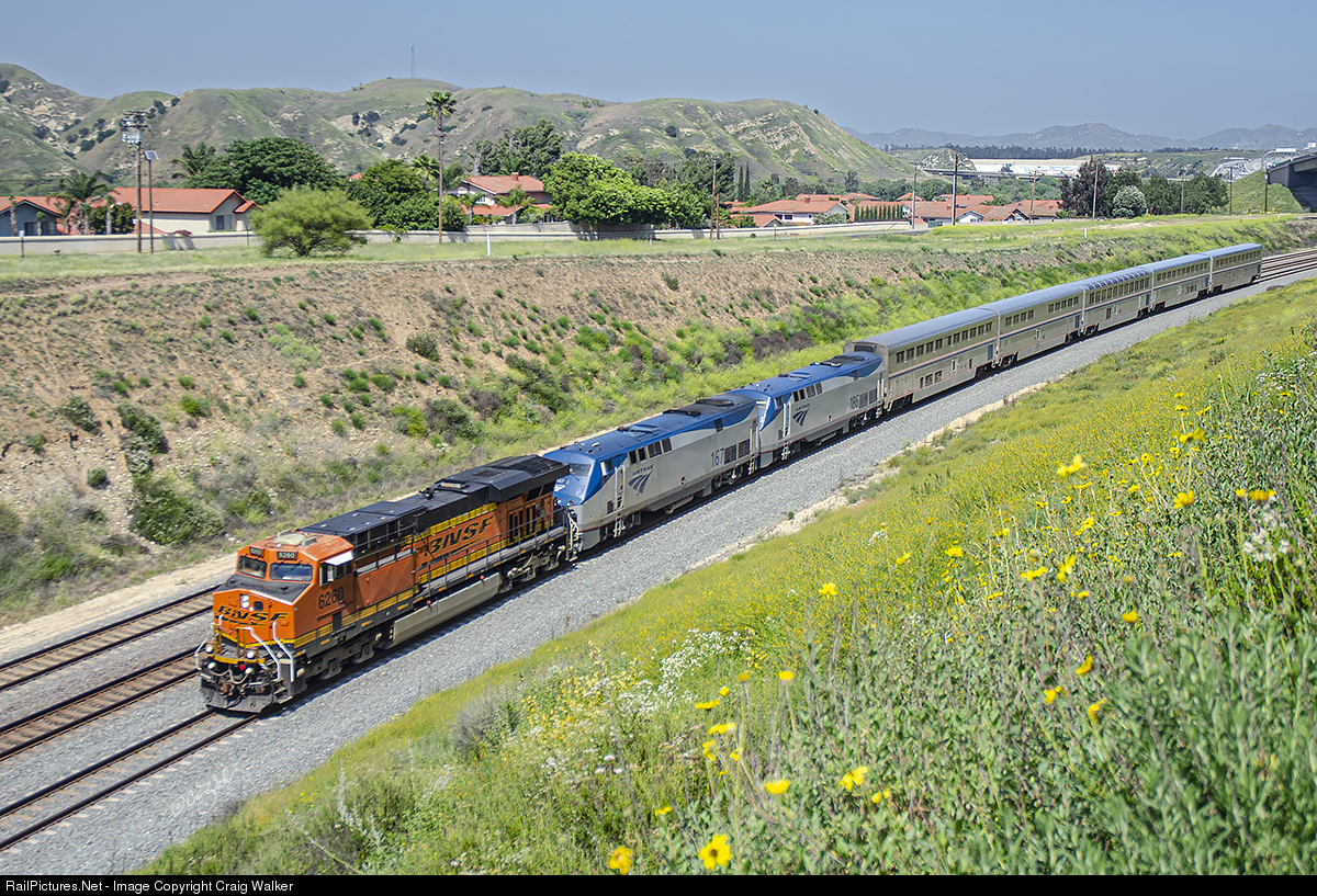 Once again, Amtrak’s Southwest Chief has become a hard-luck train. Amtrak train 3, with an abbreviated 5-car consist thanks to the COVID-19 pandemic, departed Chicago, Illinois, on April 30 and had an uneventful trip until it was approaching Kansas City, Missouri, and one of the P42DCs (167 and 186) developed some issues. After a delay, BNSF Railway ES44AC 6260 was added to the train to assist it for the rest of the trip. Of course, being a freight locomotive, it cannot operate at the higher speed at which the P42DCs are geared and so the train continued to fall behind schedule – and then got stuck behind a disabled freight train, and the encountered signal issues in the La Junta, Colorado, area. And so, here we see the westbound Chief passing through the Prado Dam area in Corona, California, about 40 miles from its final destination of Los Angeles. (Corona*, California – May 2, 2020)