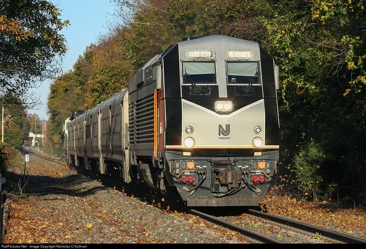 | The leaves aren't the only thing fading in this photo. NJT 4021's original number boards have significantly faded in this photograph. Being the 2nd PL42AC delivered to NJT, its number boards have seen about 12 years of weathering. On the rear of the train is NJT 4112 (ex-CNJ 3678) which is pinch-hitting in place of a cab car. |