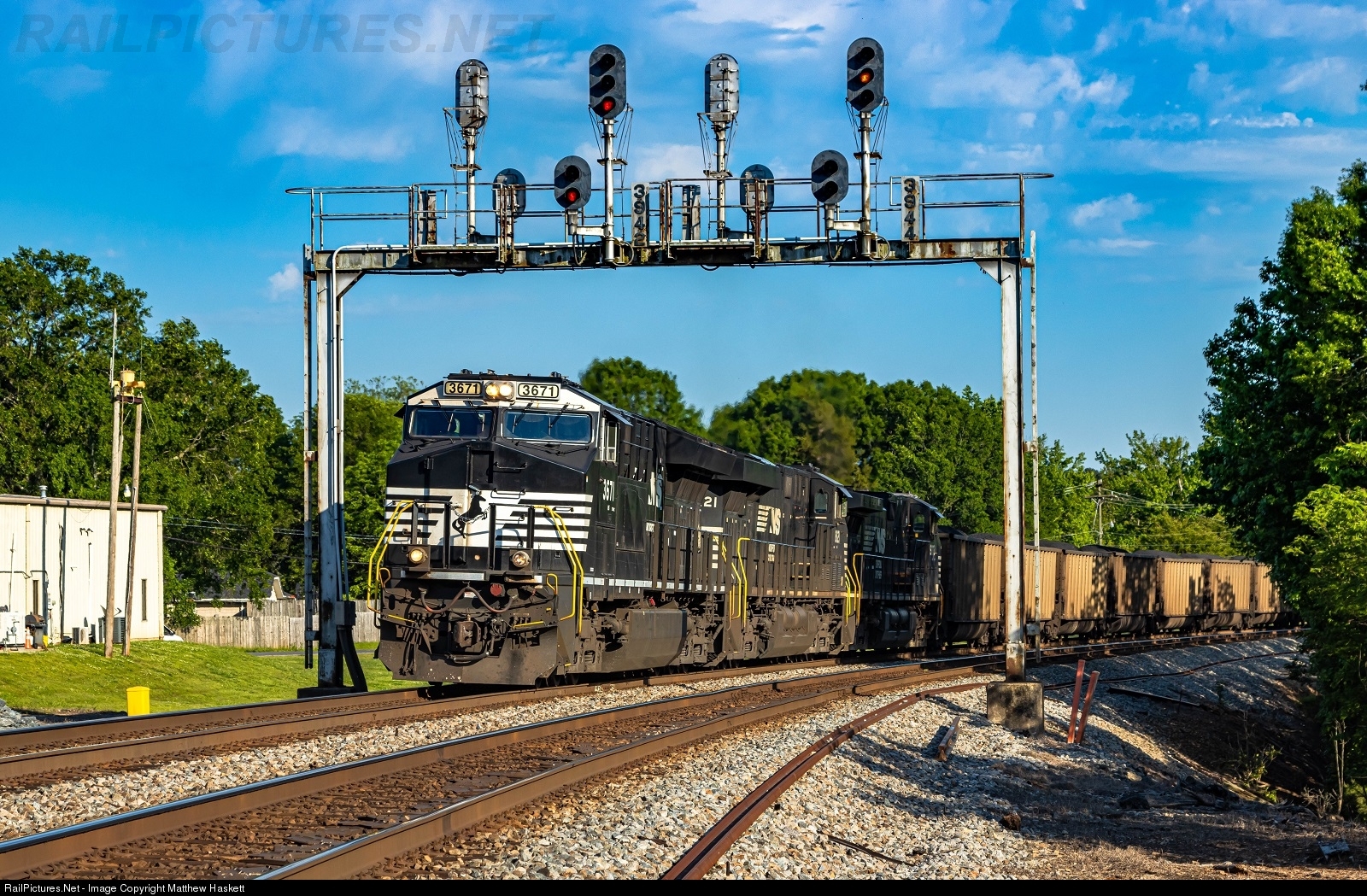| Rolling under the Southern Railway era intermediates at Lowell. 744 is lugging it's Belmont coal loads up grade towards Gastonia. Where it will run around and head back to Belmont. There is a saying that comes to ind every time I see these coal trains. "Coal keep's the lights on". So try to remember that the next time you switch on the lights or turn on the AC. |